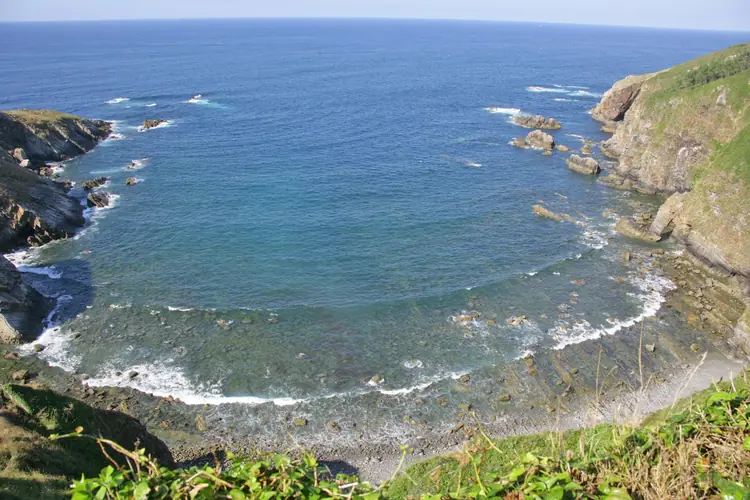 Playa de La Cueva. Al oeste del Cabo Vidio, una vez recorrido un benigno camino modelado en forma de zigzag sobre el acantilado —de marcada cuesta— que la guarece, se extiende la playa de La Cueva, que viene a ser prácticamente una p ...